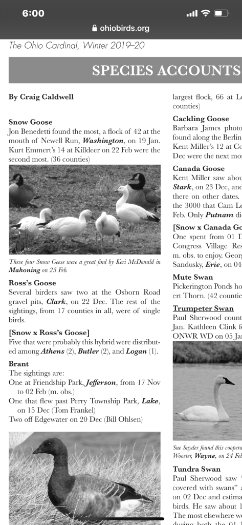 I am a member of the Ohio Ornithological Society, and I was proud to notice that, in their latest edition of their publication “The Cardinal: Winter 2019-2020,” I had an entry included. In the winter of 2020, I got the opportunity of observing Snow Geese in Mahoning, Ohio – I must say that they were initially found by another birder. A friend, who happens to be the Photo Editor, mentioned they were looking for images, so I submitted my Snow geese: